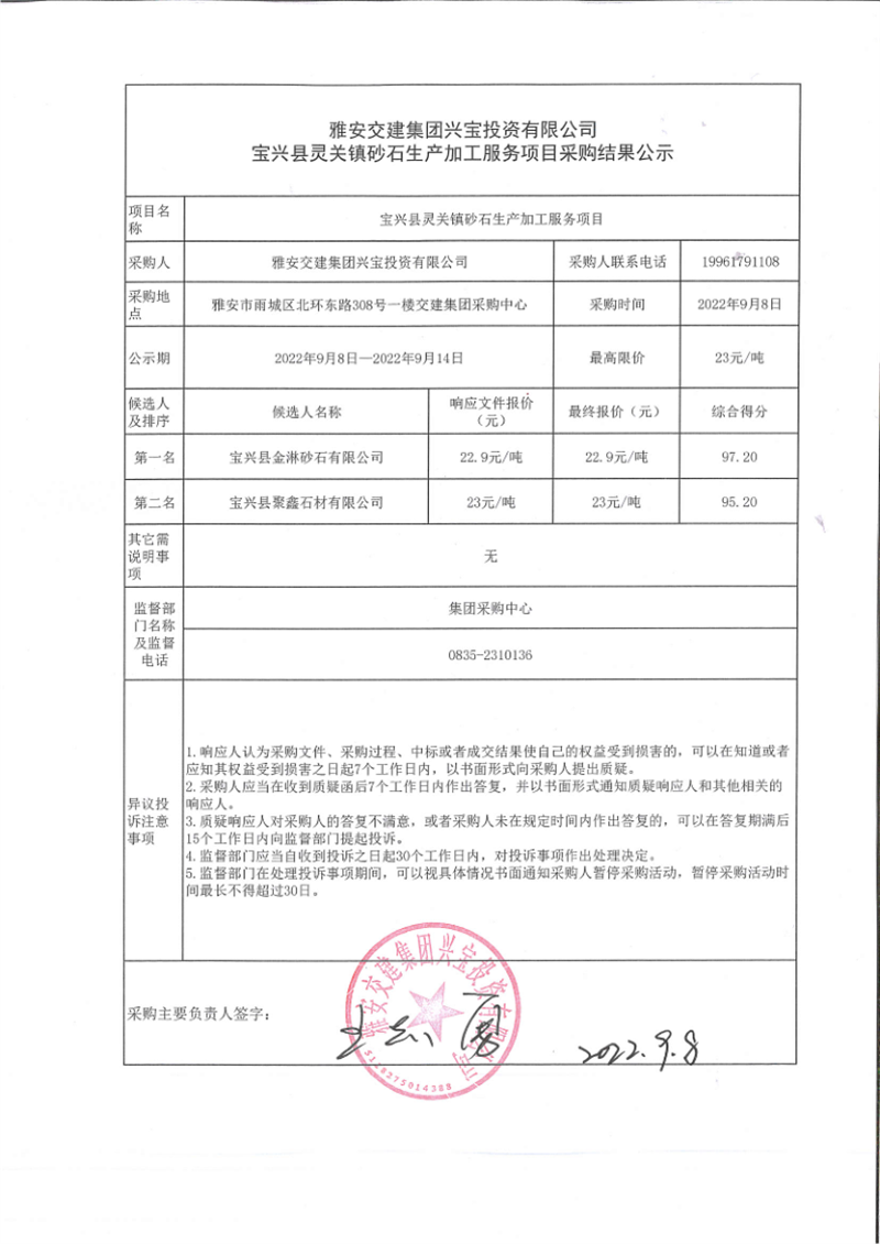 雅安交建集團(tuán)興寶投資有限公司寶興縣靈關(guān)鎮(zhèn)砂石生產(chǎn)加工服務(wù)項(xiàng)目采購結(jié)果公示
