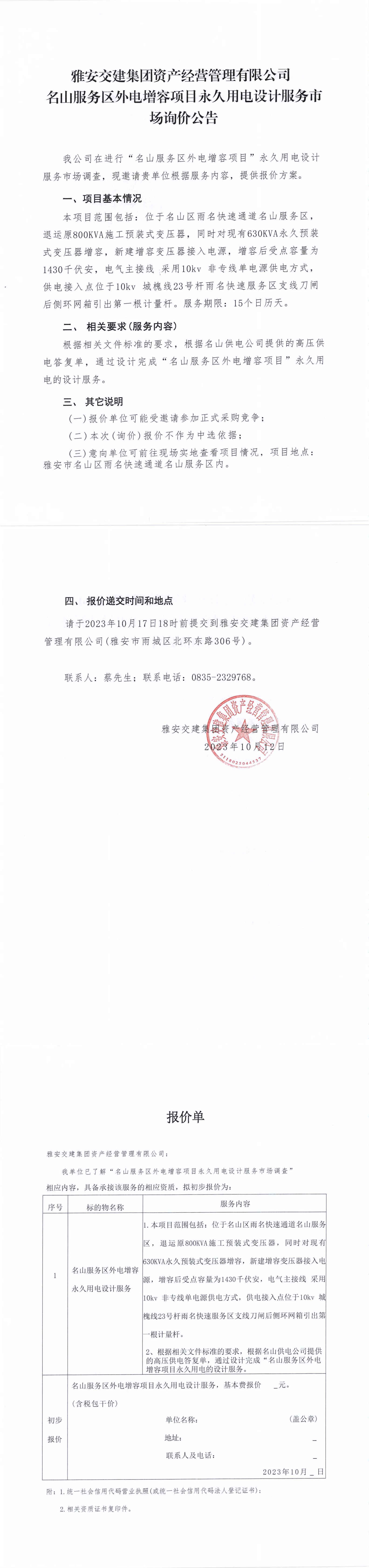 雅安交建集團資產(chǎn)經(jīng)營管理有限公司名山服務區(qū)外電增容項目永久用電設計服務市場詢價公告