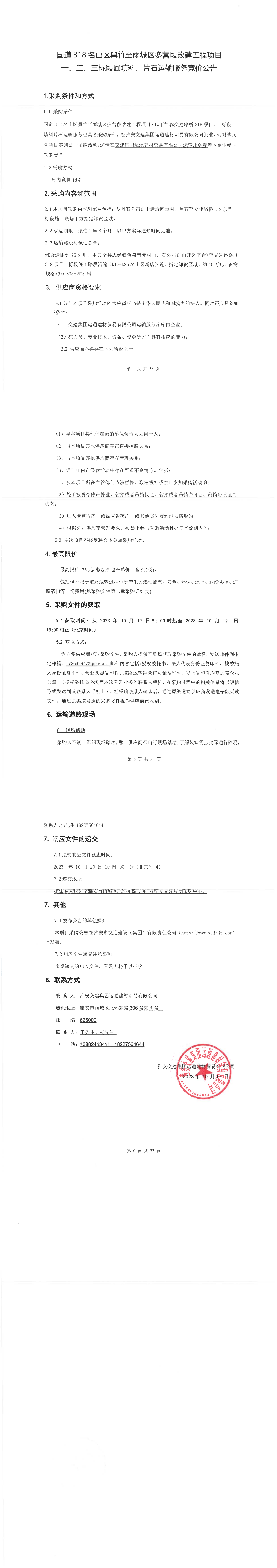 雅安交建集團運通建材貿(mào)易有限公司國道名山區(qū)黑竹至雨城區(qū)多營段改建工程項目一、二、三標段回填料、片石運輸服務競價公告