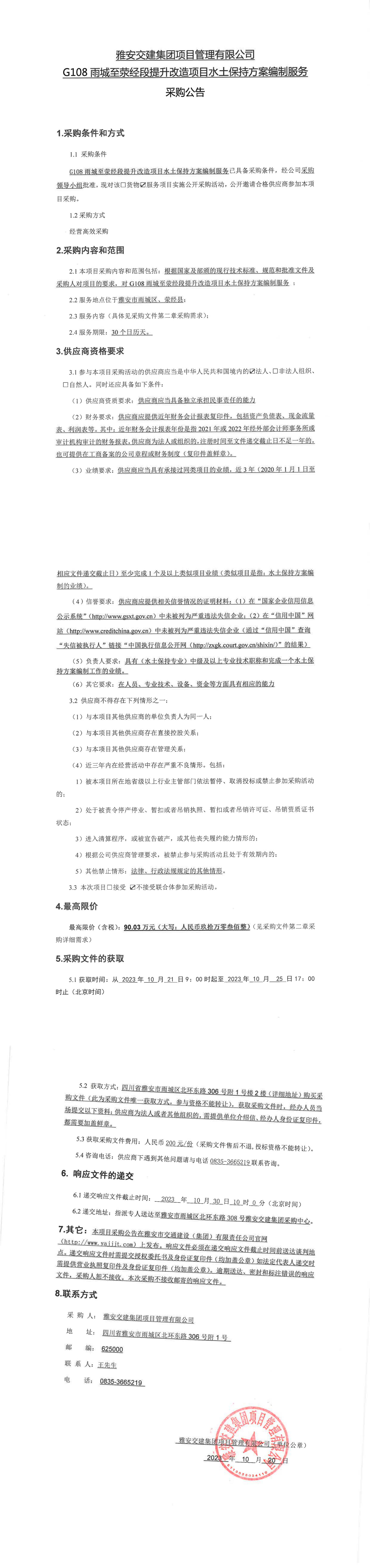 雅安交建集團項目管理有限公司G108雨城至滎經(jīng)段提升改造項目水土保持方案編制服務(wù)采購公告