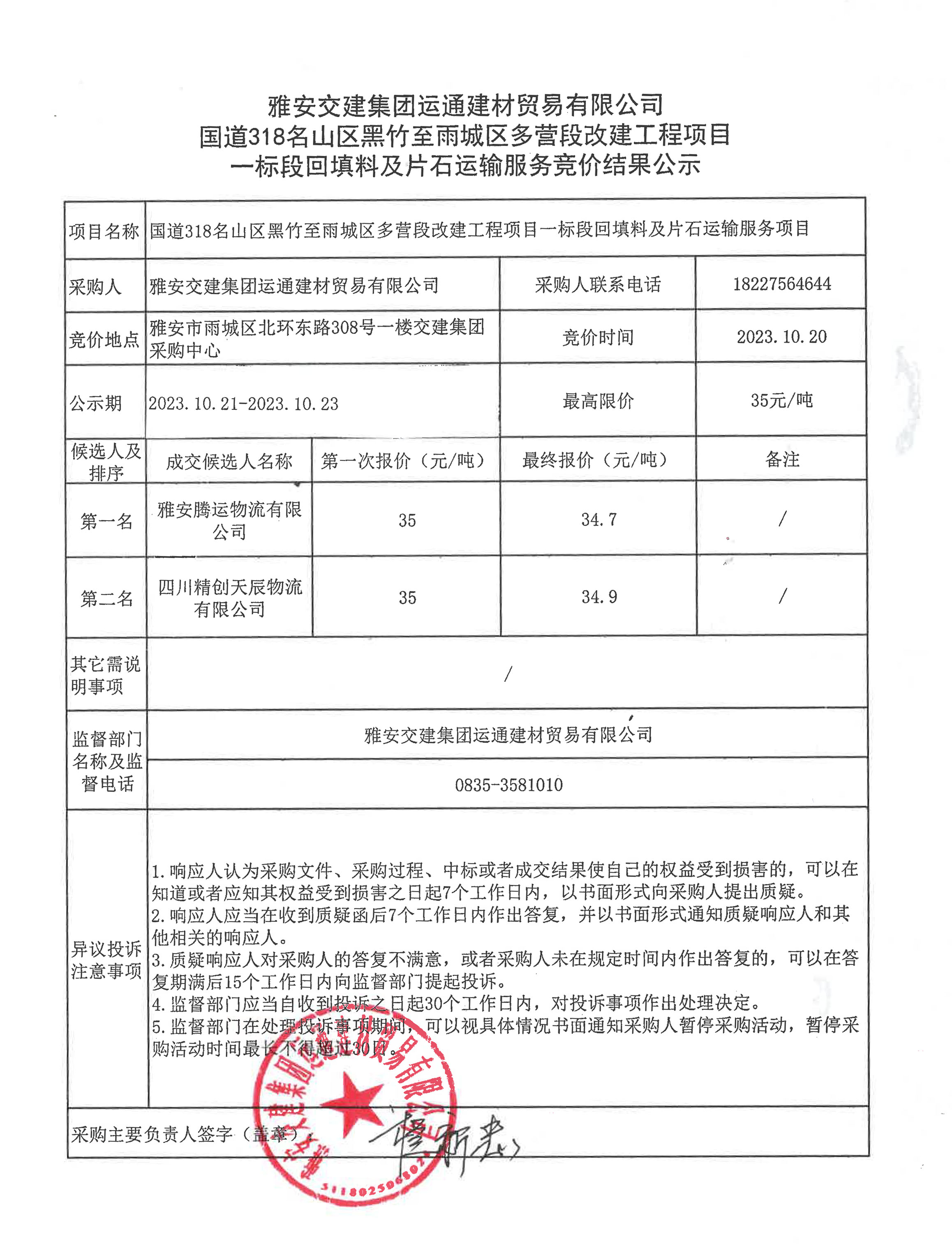 雅安交建集團運通建材貿(mào)易有限公司 國道318名山區(qū)黑竹至雨城區(qū)多營段改建工程項目一標段回填料及片石運輸服務競價結(jié)果公示