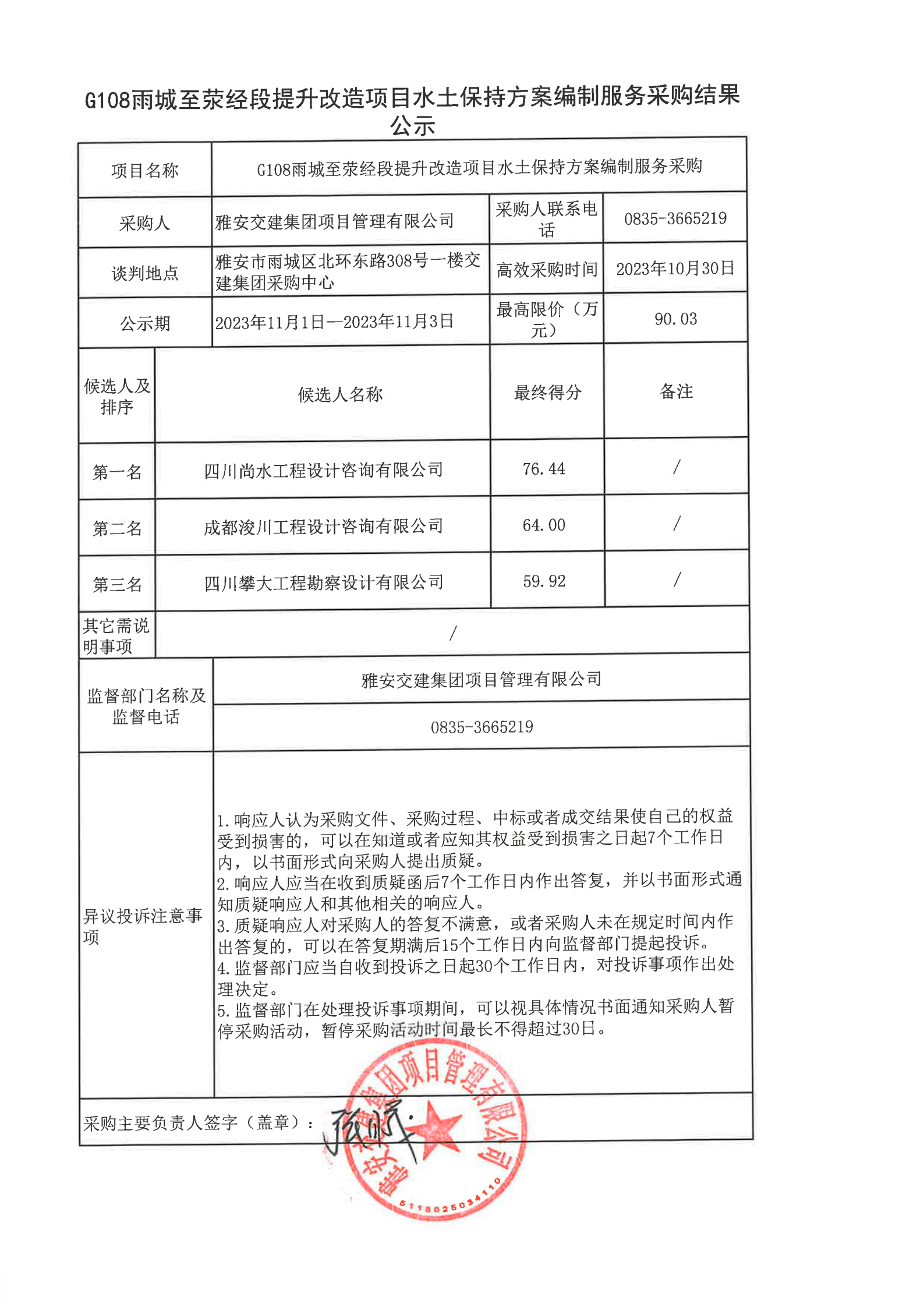 雅安交建集團(tuán)項(xiàng)目管理有限公司G108雨城至滎經(jīng)段提升改造項(xiàng)目水土保持方案編制服務(wù)采購(gòu)結(jié)果公示