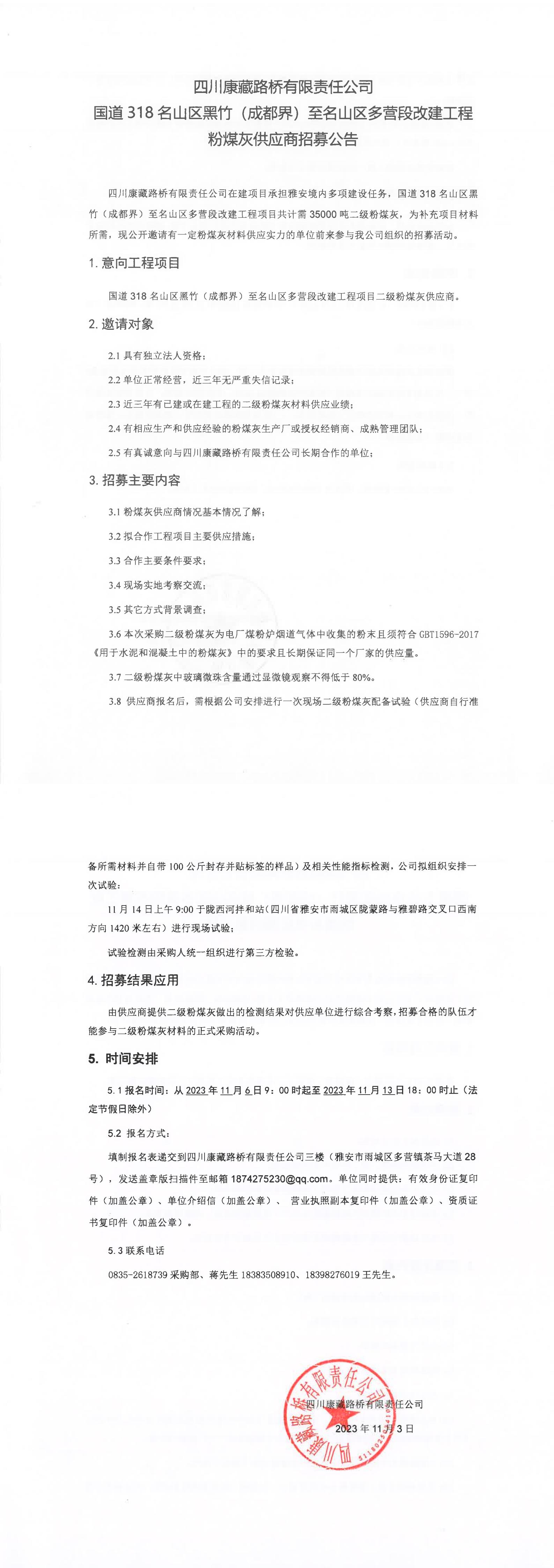 四川康藏路橋有限責任公司國道318名山區(qū)黑竹(成都界)至名山區(qū)多營段改建工程粉煤灰供應商招募公告