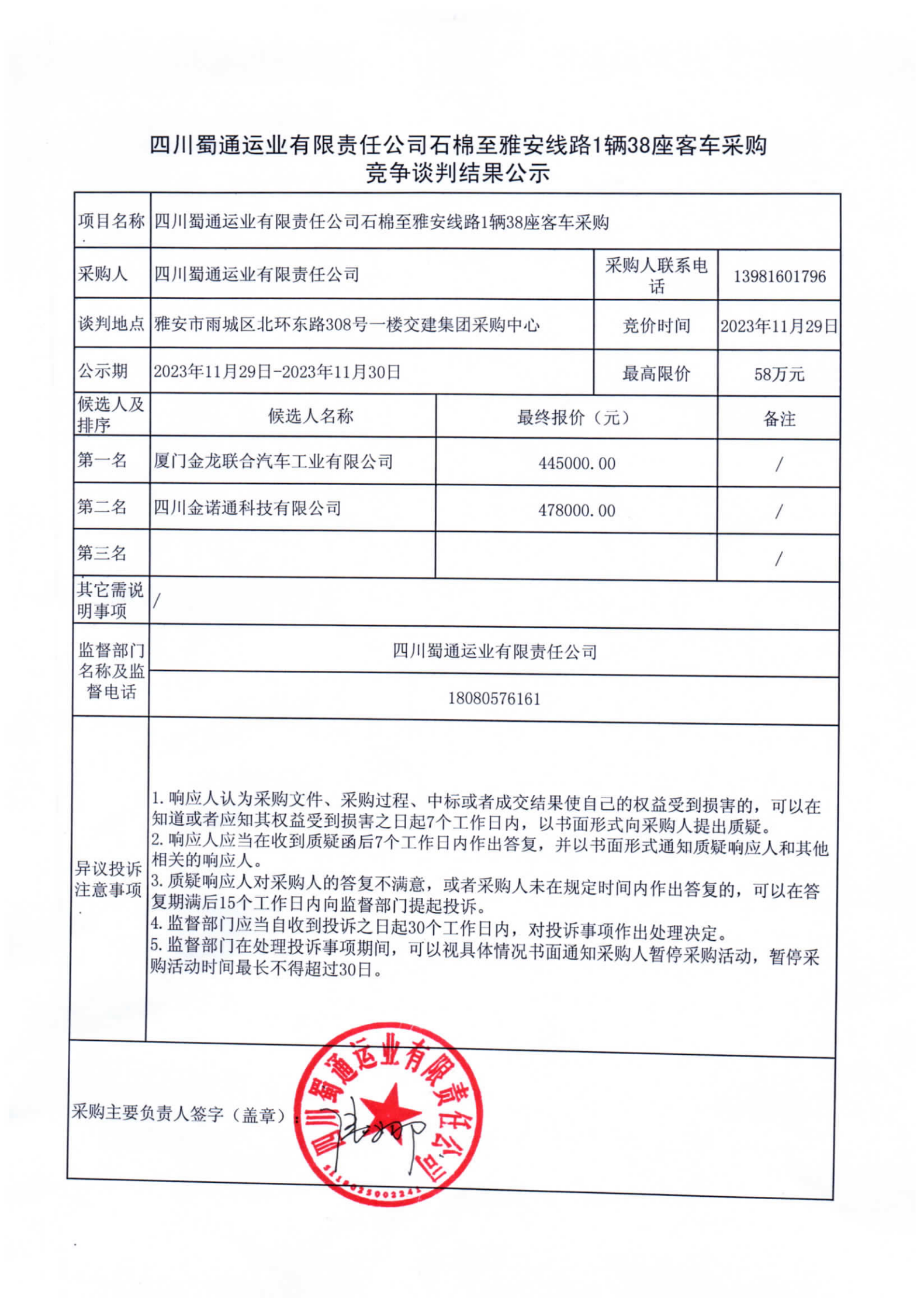 四川蜀通運業(yè)有限責任公司石棉至雅安線路1輛38座客車采購競爭談判結(jié)果公示