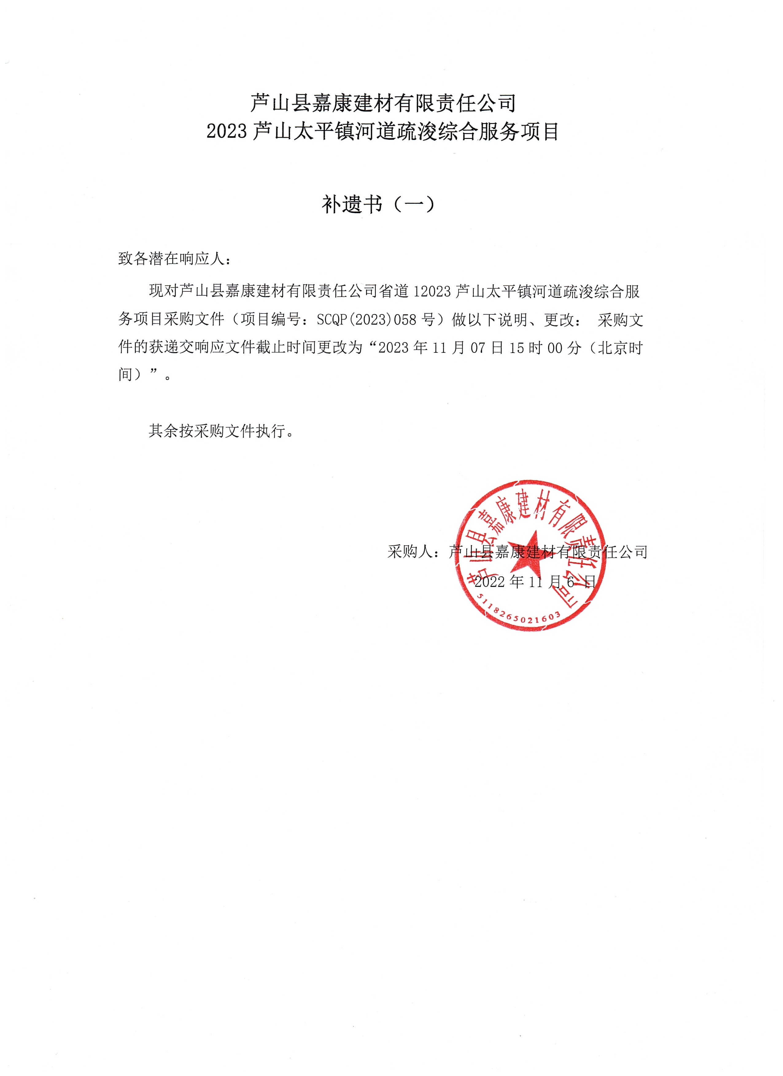 蘆山縣嘉康嘉康建材有限責任公司2023蘆山太平鎮(zhèn)河道疏浚綜合服務項目補遺書(一)