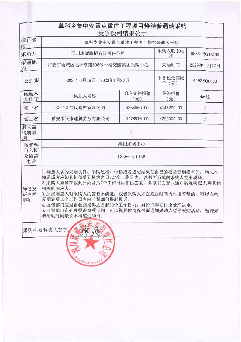 四川康藏路橋有限責(zé)任公司草科鄉(xiāng)集中安置點重建工程項目燒結(jié)普通磚采購競爭談判結(jié)果公示