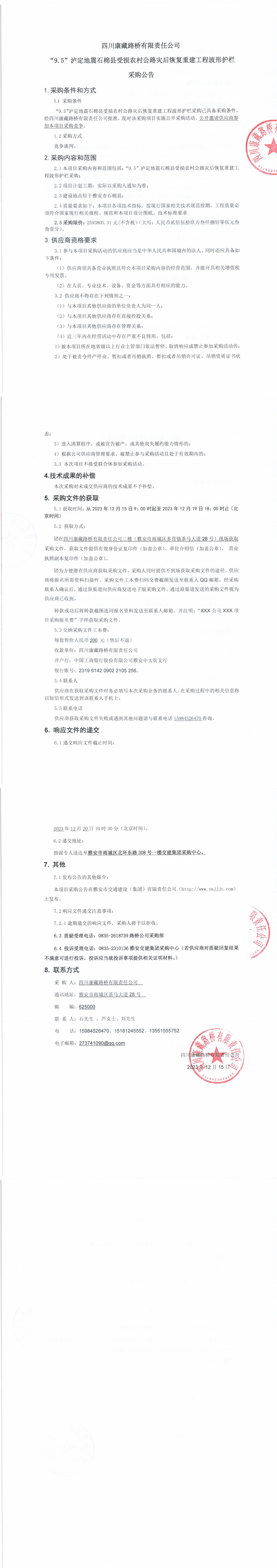 四川康藏路橋有限責任公司“9.5”瀘定地震石棉縣受損農(nóng)村公路災后恢復重建工程波形護欄采購公告