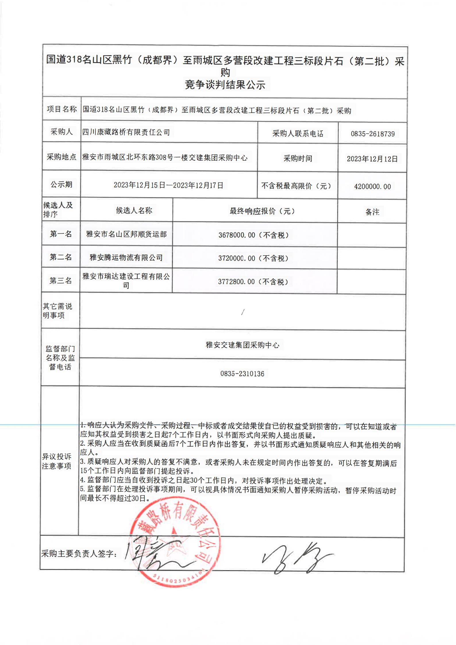 四川康藏路橋有限責(zé)任公司國(guó)道318名山區(qū)黑竹(成都界)至雨城區(qū)多營(yíng)段改建工程三標(biāo)段片石(第二批)采購競(jìng)爭(zhēng)談判結(jié)果
