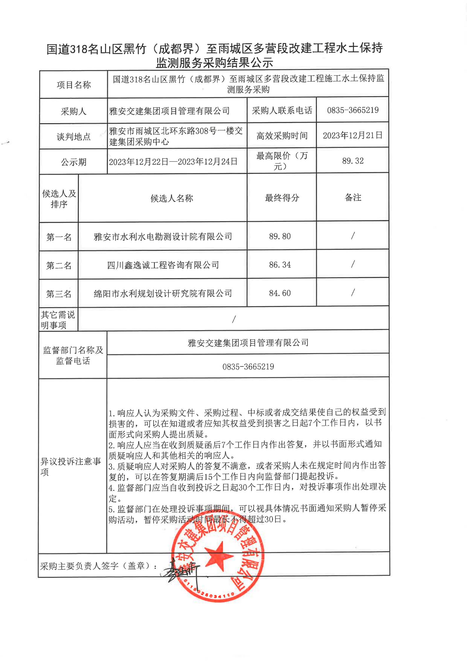 雅安交建集團(tuán)項(xiàng)目管理有限公司國道318名山區(qū)黑竹(成都界)至雨城區(qū)多營段改建工程水土保持監(jiān)測服務(wù)采購結(jié)果公示