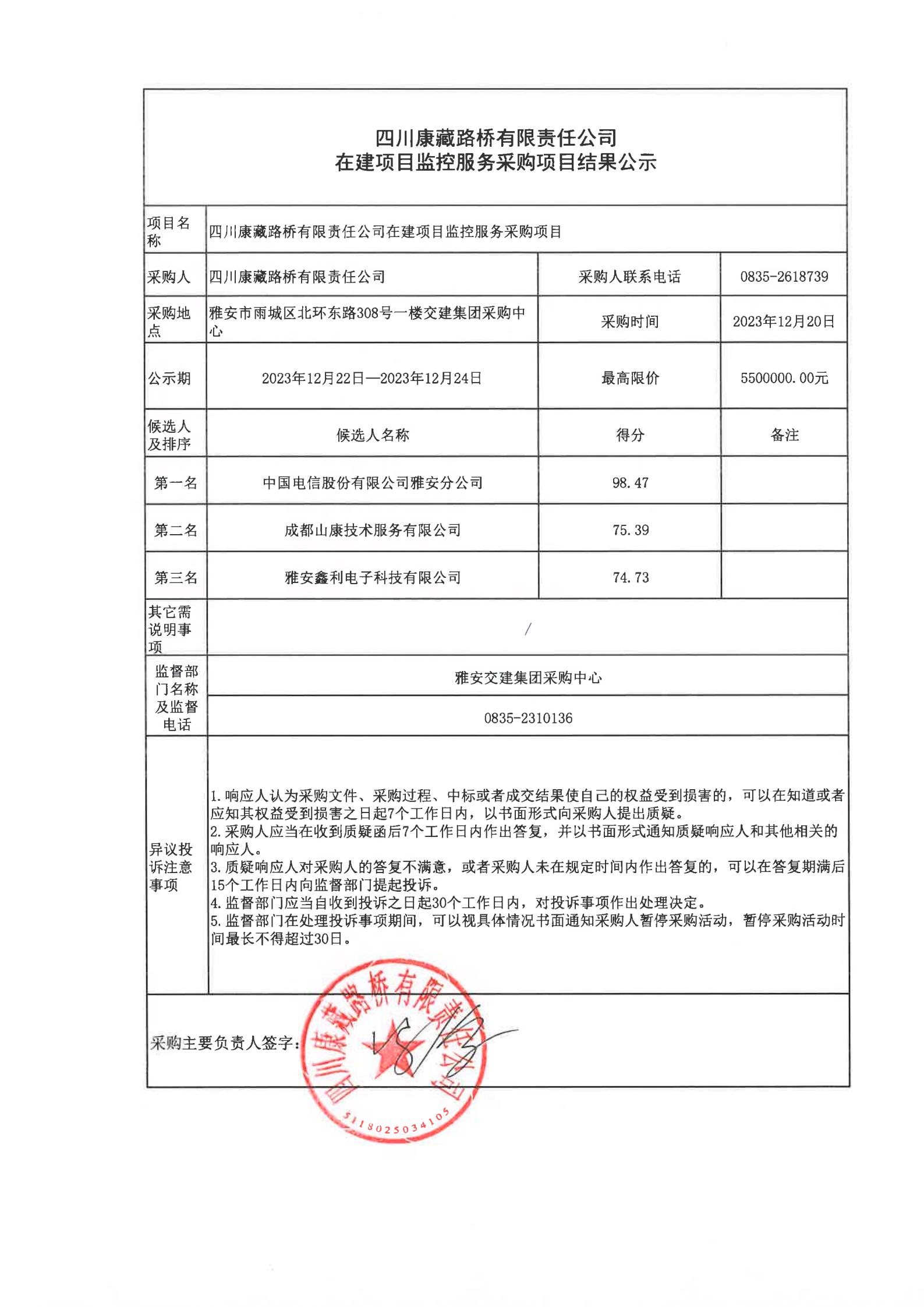 四川康藏路橋有限責(zé)任公司在建項(xiàng)目監(jiān)控服務(wù)采購項(xiàng)目結(jié)果公示