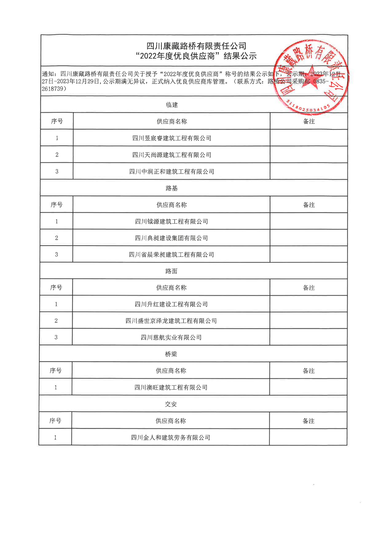四川康藏路橋有限責(zé)任公司“2022年度優(yōu)良供應(yīng)商”結(jié)果公示