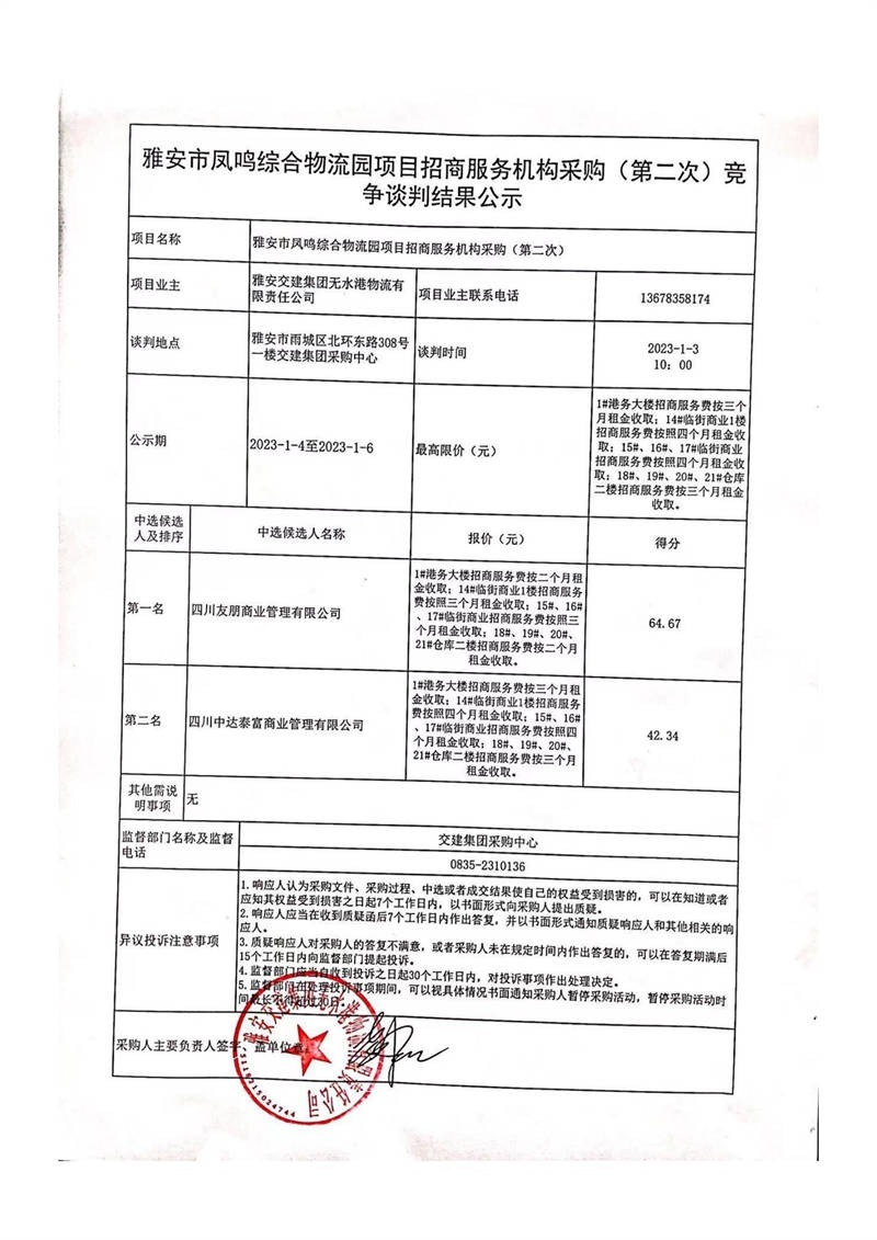 雅安交建集團無水港物流有限責任公司雅安市鳳鳴綜合物流園項目招商服務機構采購(第二次)競爭談判結果公示