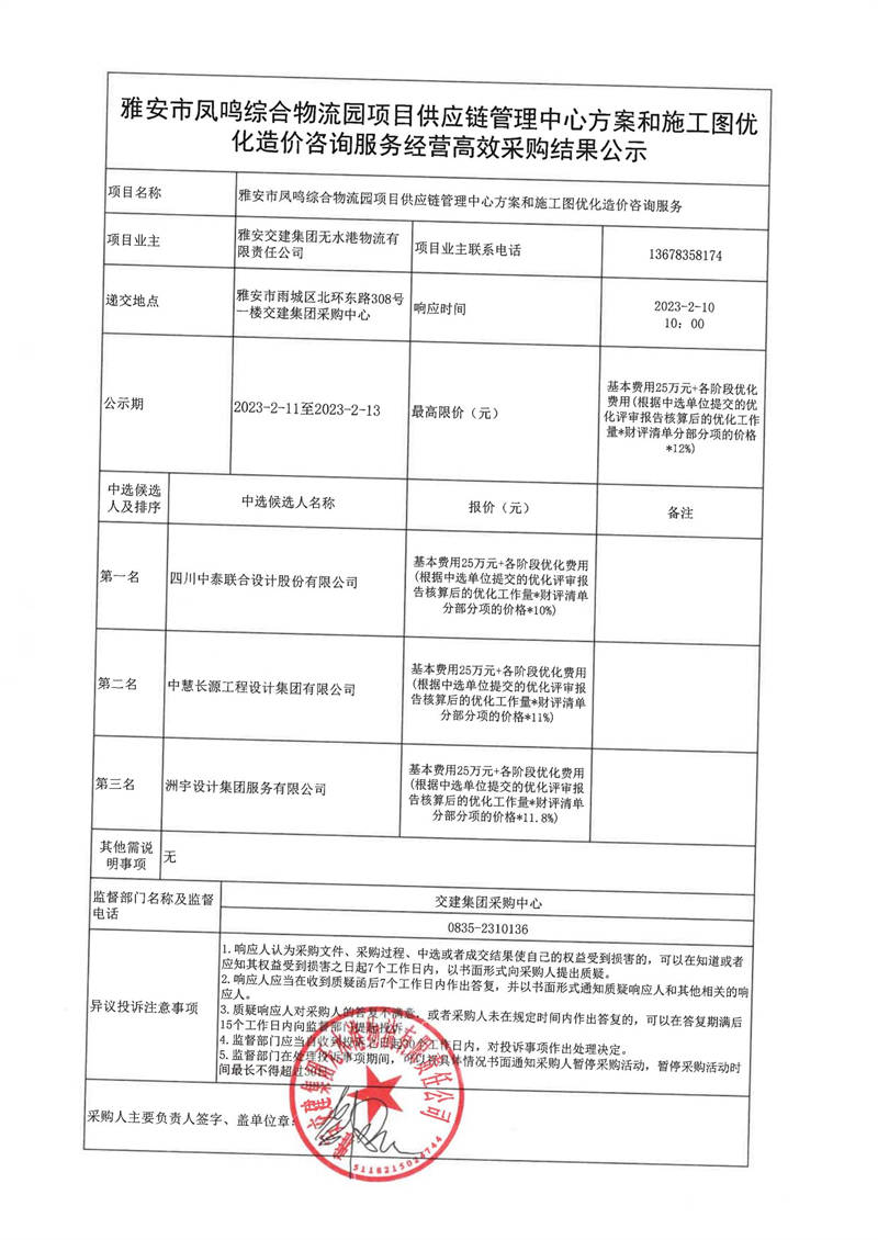 雅安交建集團(tuán)無水港物流有限責(zé)任公司雅安市鳳鳴綜合物流園項(xiàng)目供應(yīng)鏈管理中心方案和施工圖優(yōu)化造價(jià)咨詢服務(wù)經(jīng)營高效采購結(jié)果公示
