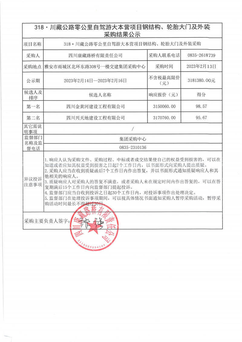 四川康藏路橋有限責(zé)任公司318.川藏公路零公里自駕游大本營(yíng)項(xiàng)目鋼結(jié)構(gòu)、輪胎大門及外裝采購(gòu)結(jié)果公示