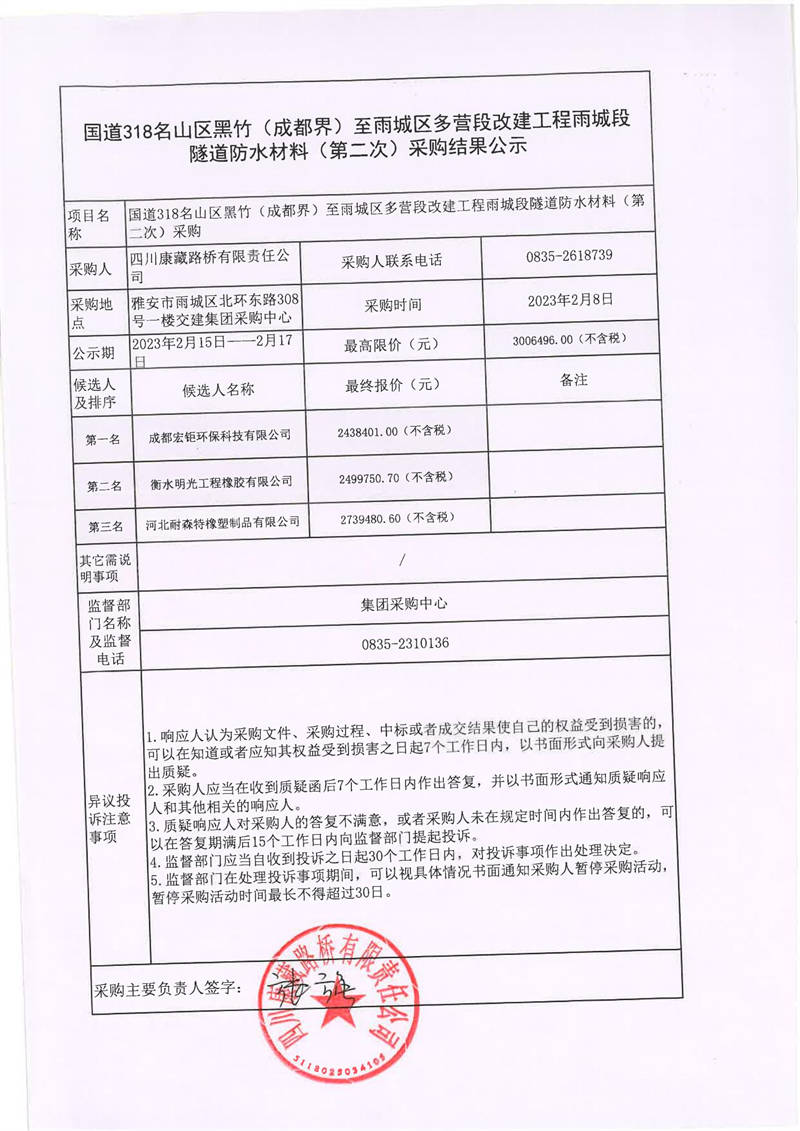 四川康藏路橋有限責(zé)任公司國道318線名山區(qū)黑竹(成都界)至雨城區(qū)多營段改建工程雨城段隧道防水材料(第二次)采購
