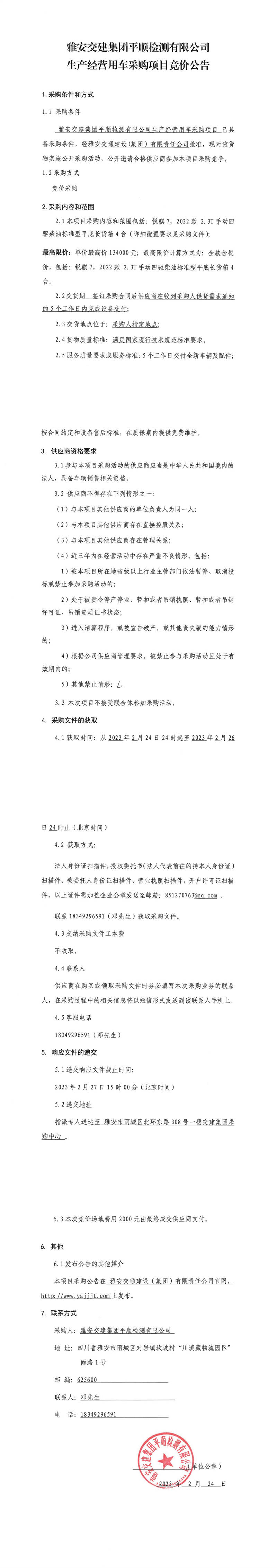 雅安交建集團平順檢測有限公司生產(chǎn)經(jīng)營用車采購項目競價公告