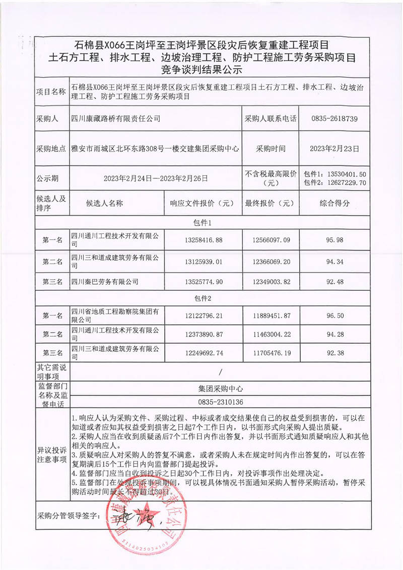 四川康藏路橋有限責任公司石棉縣X066王崗坪至王崗坪景區(qū)段災(zāi)后恢復(fù)重建工程項目土石方工程、排水工程、邊坡治理工程、防護工程施工勞務(wù)采購項目競爭談判結(jié)果公示
