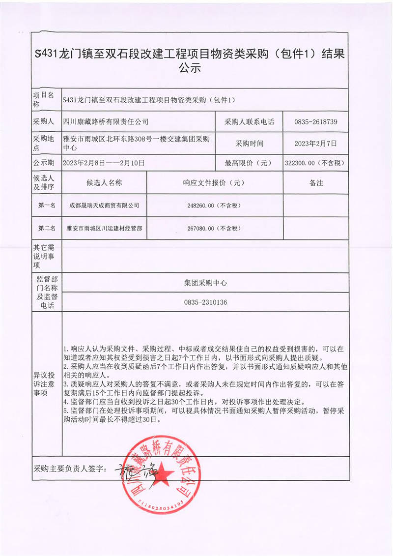 四川康藏路橋有限責(zé)任公司S431龍門鎮(zhèn)至雙石段改建工程項(xiàng)目物資類采購(gòu)(包件1、包件2)結(jié)果公示