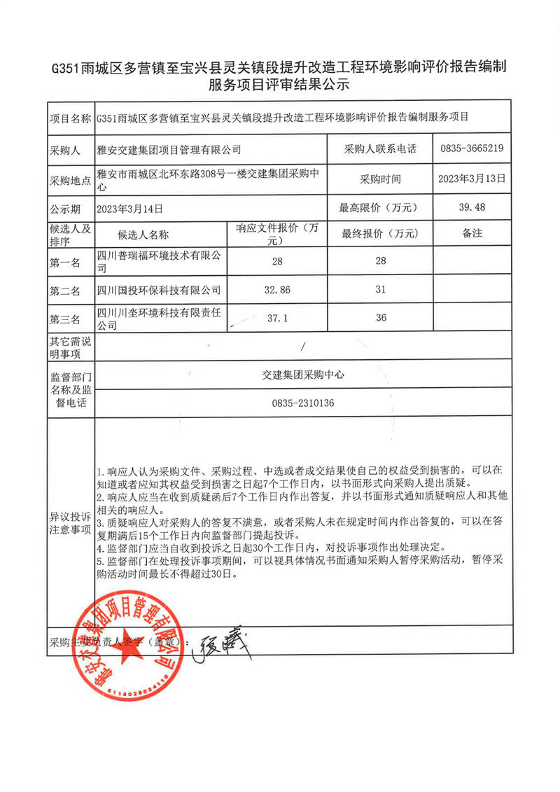 雅安交建集團(tuán)項目管理有限公司G351雨城區(qū)多營鎮(zhèn)至寶興縣靈關(guān)鎮(zhèn)段提升改造工程環(huán)境影響評價報告編制服務(wù)項目結(jié)果公示