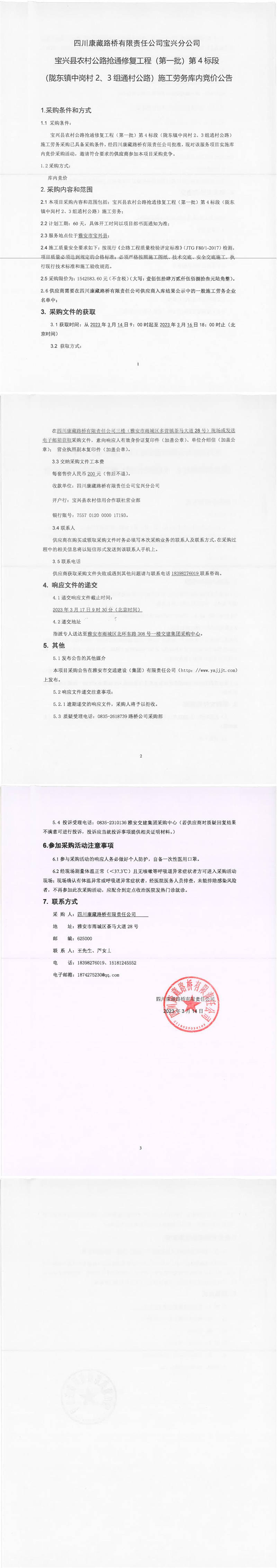 四川康藏路橋有限責(zé)任公司寶興分公司寶興縣農(nóng)村公路搶通修復(fù)工程(第一批)第4標(biāo)段(隴東鎮(zhèn)中崗村2、3組通村公路)施工勞務(wù)庫內(nèi)競價公告