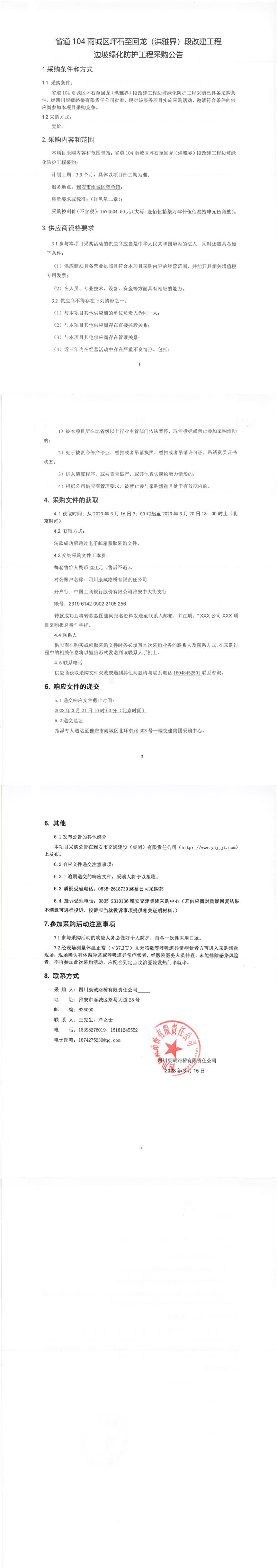 四川康藏路橋有限責(zé)任公司省道104雨城區(qū)坪石至回龍(洪雅界)段改建工程邊坡綠化防護工程采購公告