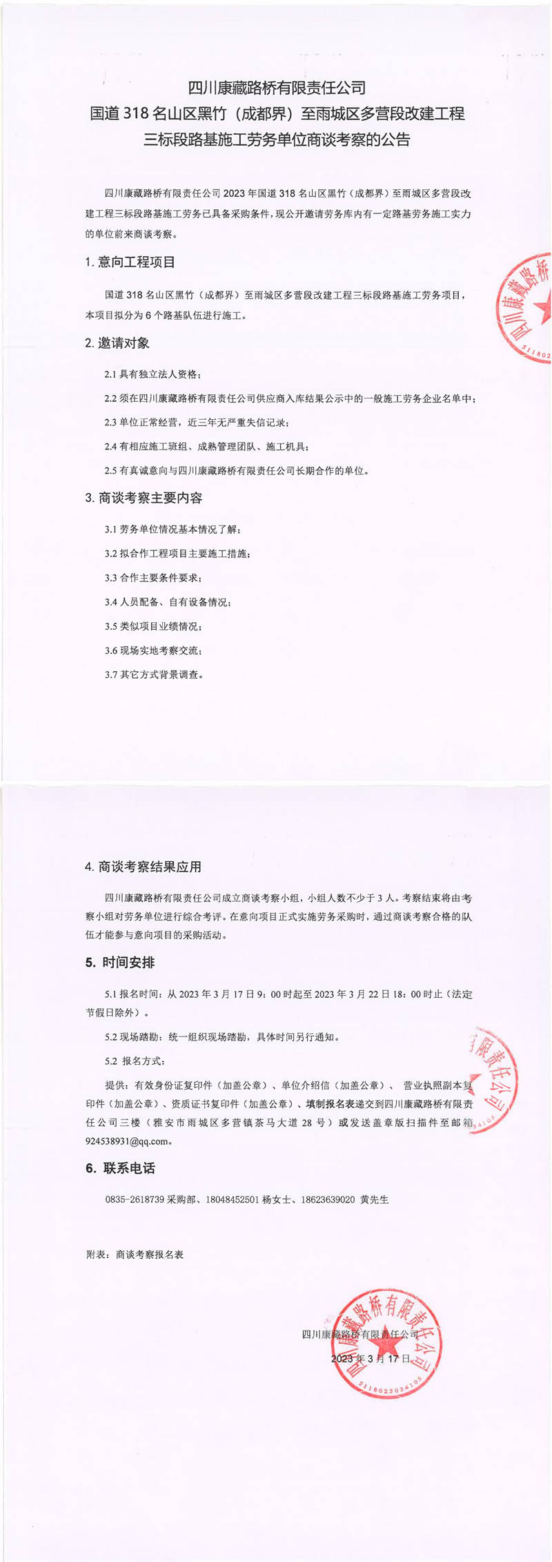 四川康藏路橋有限責任公司國道318名山區(qū)黑竹(成都界)至雨城區(qū)多營段改建工程三標段路基施工勞務(wù)單位商談考察的公告