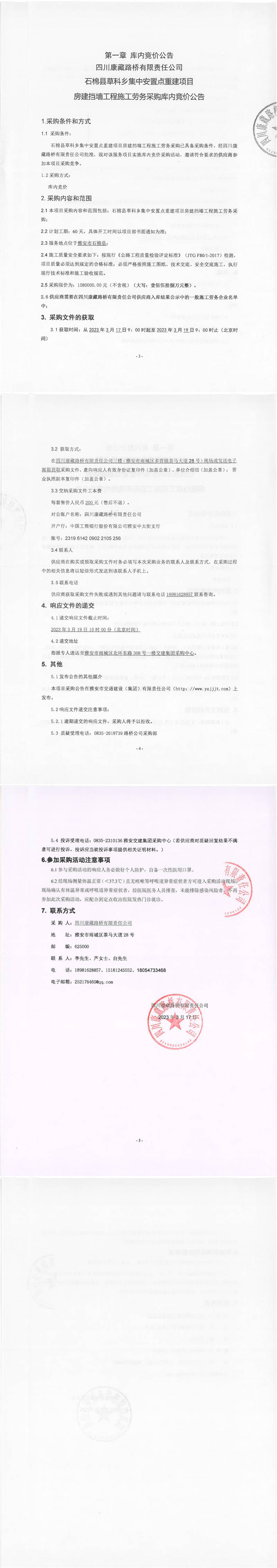 四川康藏路橋有限責(zé)任公司石棉草科鄉(xiāng)集中安置點(diǎn)重建項(xiàng)目房建擋墻工程施工勞務(wù)采購庫內(nèi)競價(jià)公告