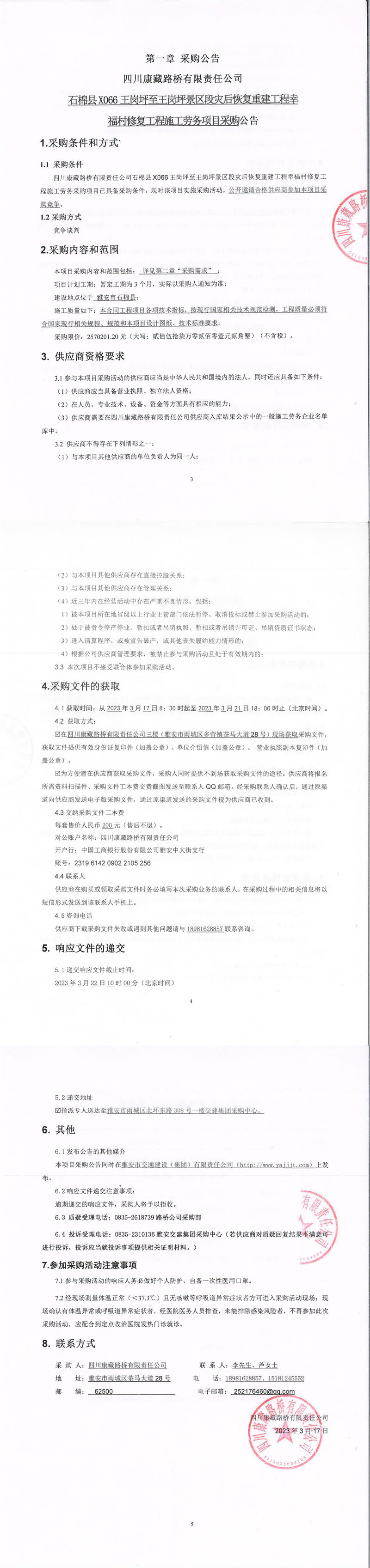 四川康藏路橋有限責(zé)任公司石棉縣X066王崗坪至王崗坪景區(qū)段災(zāi)后恢復(fù)重建工程幸福村修復(fù)工程施工勞務(wù)項(xiàng)目采購公告