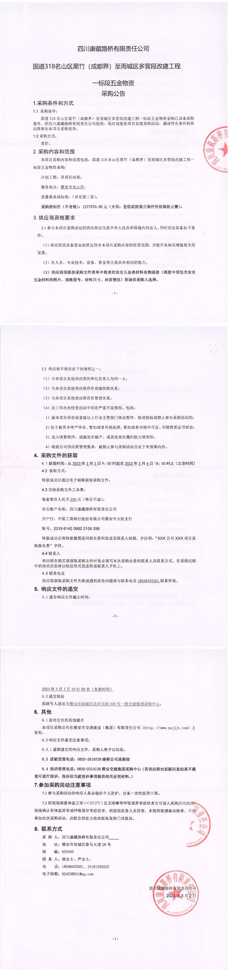 四川康藏路橋有限責(zé)任公司國(guó)道318名山區(qū)黑竹(成都界)至雨城區(qū)多營(yíng)段改建工程一標(biāo)段五金物資采購(gòu)公告