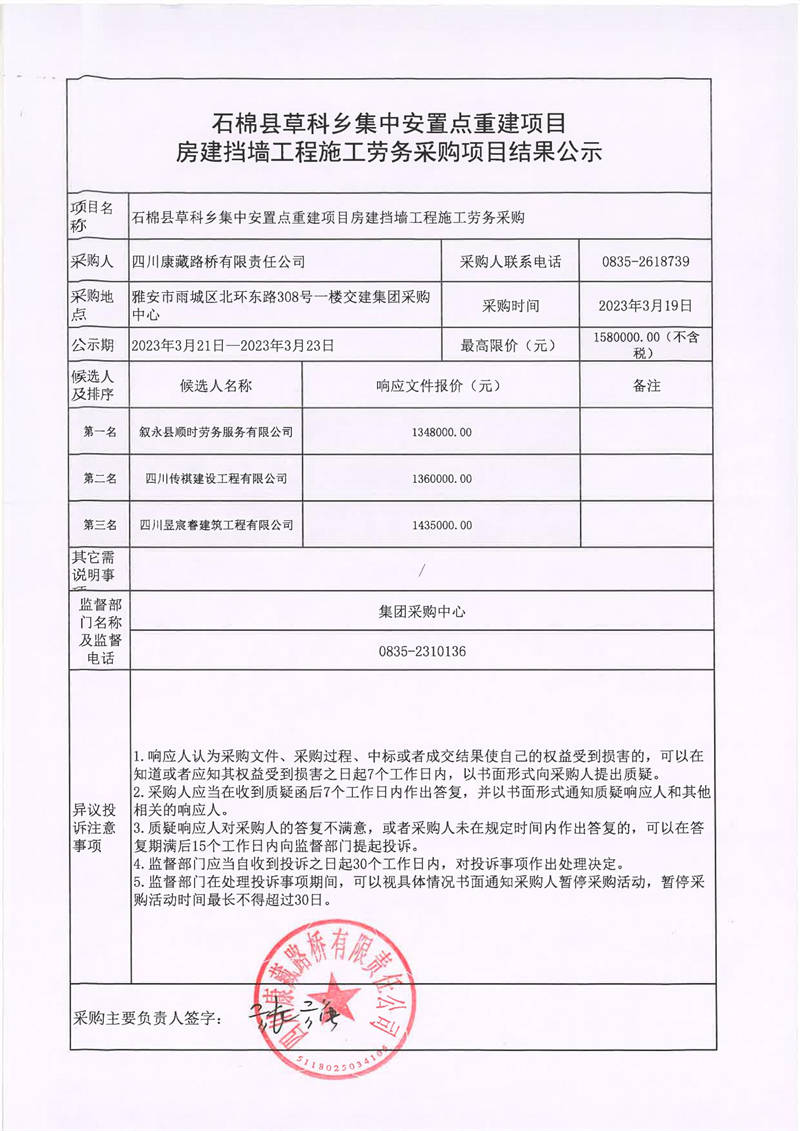四川康藏路橋有限責任公司石棉縣草科鄉(xiāng)集中安置點重建項目房建擋墻工程施工勞務采購項目結果公示