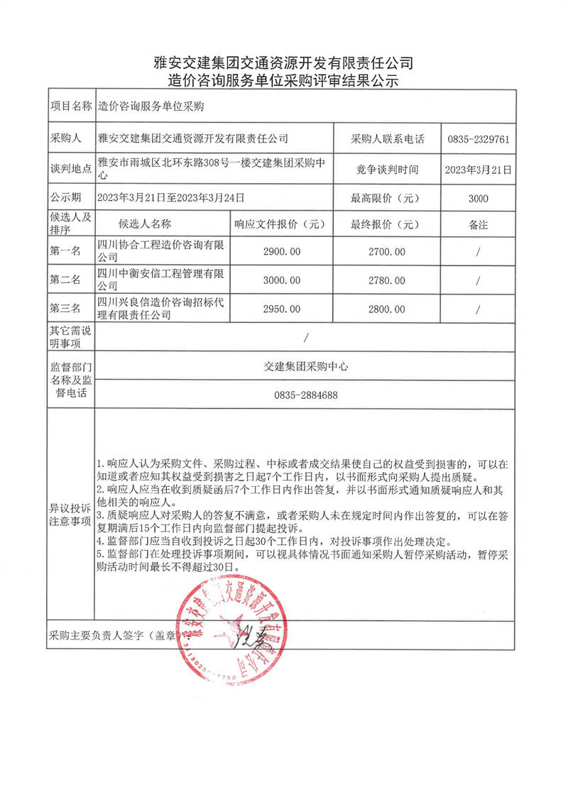 雅安交建集團(tuán)交通資源開發(fā)有限責(zé)任公司造價(jià)咨詢服務(wù)單位采購評審結(jié)果公示