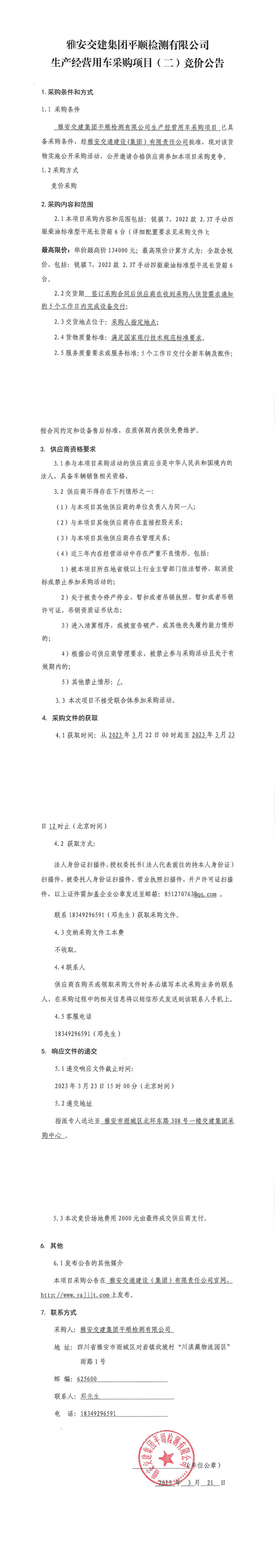 雅安交建集團(tuán)平順檢測有限公司平順公司生產(chǎn)經(jīng)營用車采購項(xiàng)目(二)競價公告