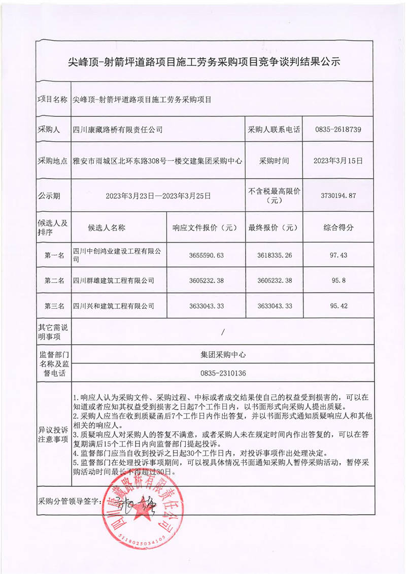 四川康藏路橋有限責(zé)任公司尖峰頂-射箭坪道路項(xiàng)目施工勞務(wù)采購項(xiàng)目競爭談判結(jié)果公示