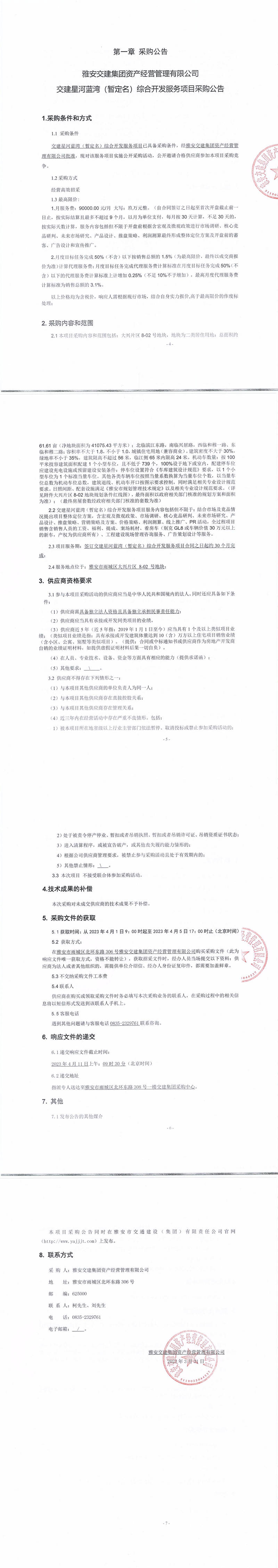 雅安交建集團資產(chǎn)經(jīng)營管理有限公司交建星河藍灣(暫定名)綜合開發(fā)服務(wù)項目采購公告