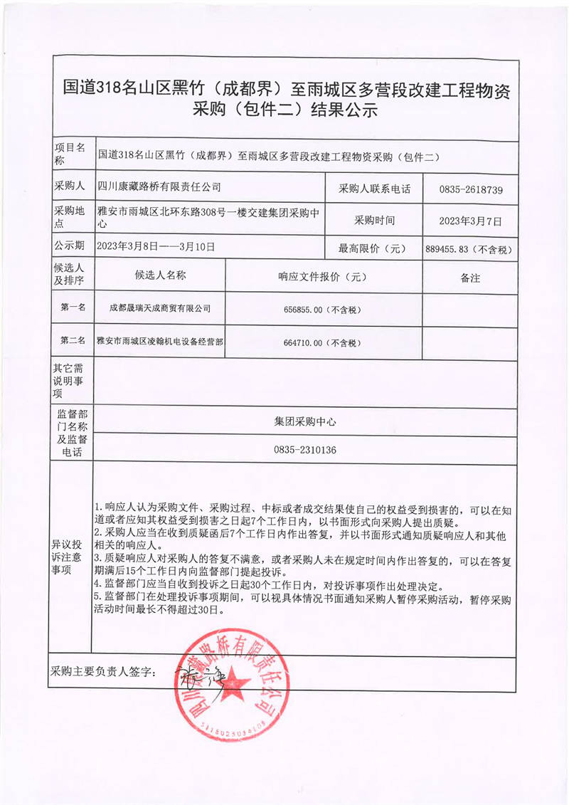 四川康藏路橋有限責(zé)任公司國(guó)道318名山區(qū)黑竹(成都界)至雨城區(qū)多營(yíng)段改建工程物資采購(包件二)結(jié)果公示