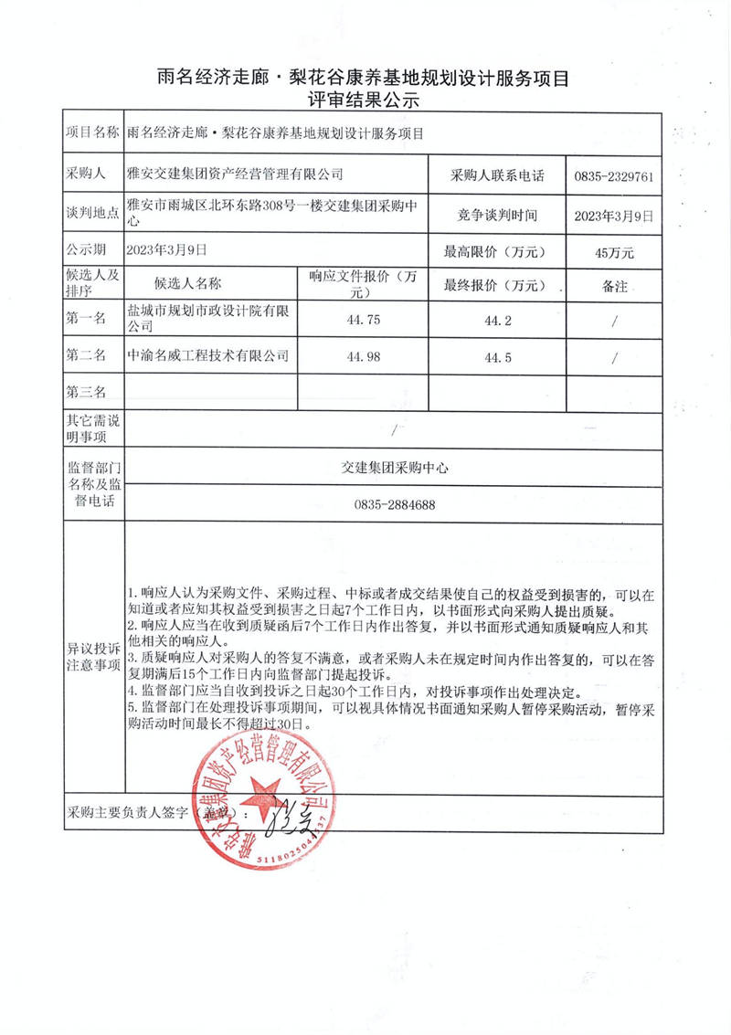 雅安交建集團資產(chǎn)經(jīng)營管理有限公司雨名經(jīng)濟走廊·梨花谷康養(yǎng)基地規(guī)劃設計服務項目采購結果公示