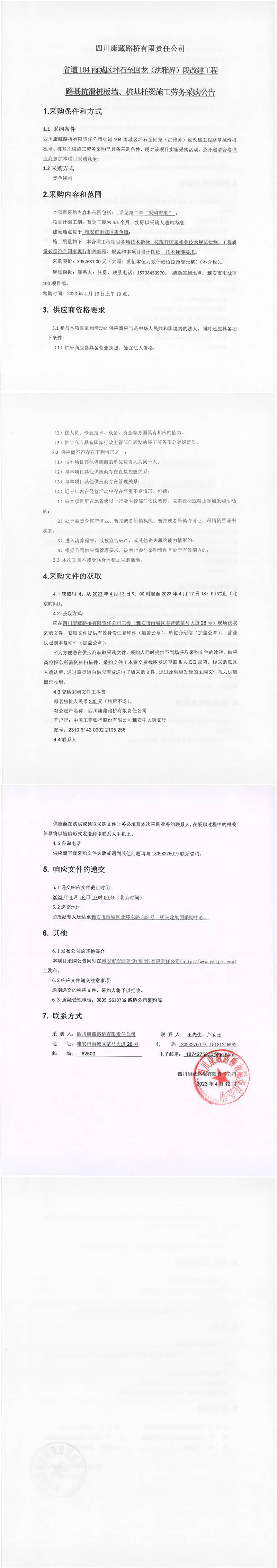 四川康藏路橋有限責任公司省道104雨城區(qū)坪石至回龍(洪雅界)段改建工程路基抗滑樁板墻、樁基托梁施工勞務(wù)采購公告