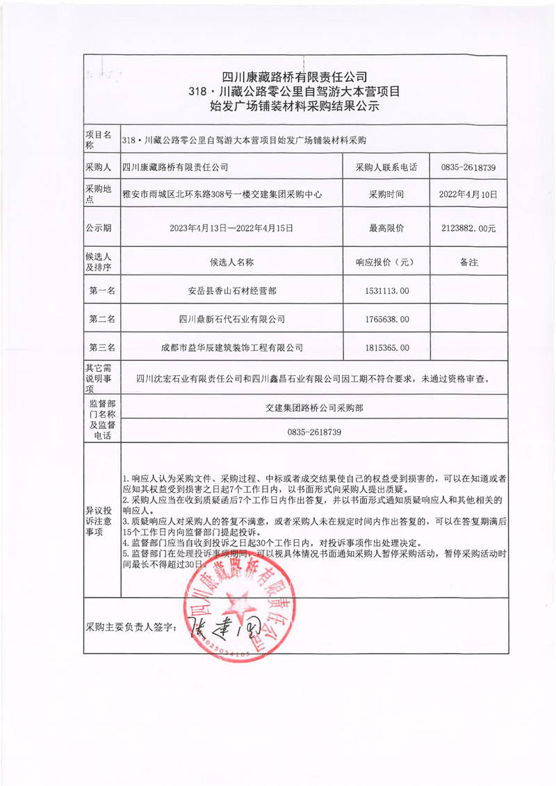 四川康藏路橋有限責任公司318·川藏公路零公里自駕游大本營項目始發(fā)廣場鋪裝材料采購結果公示
