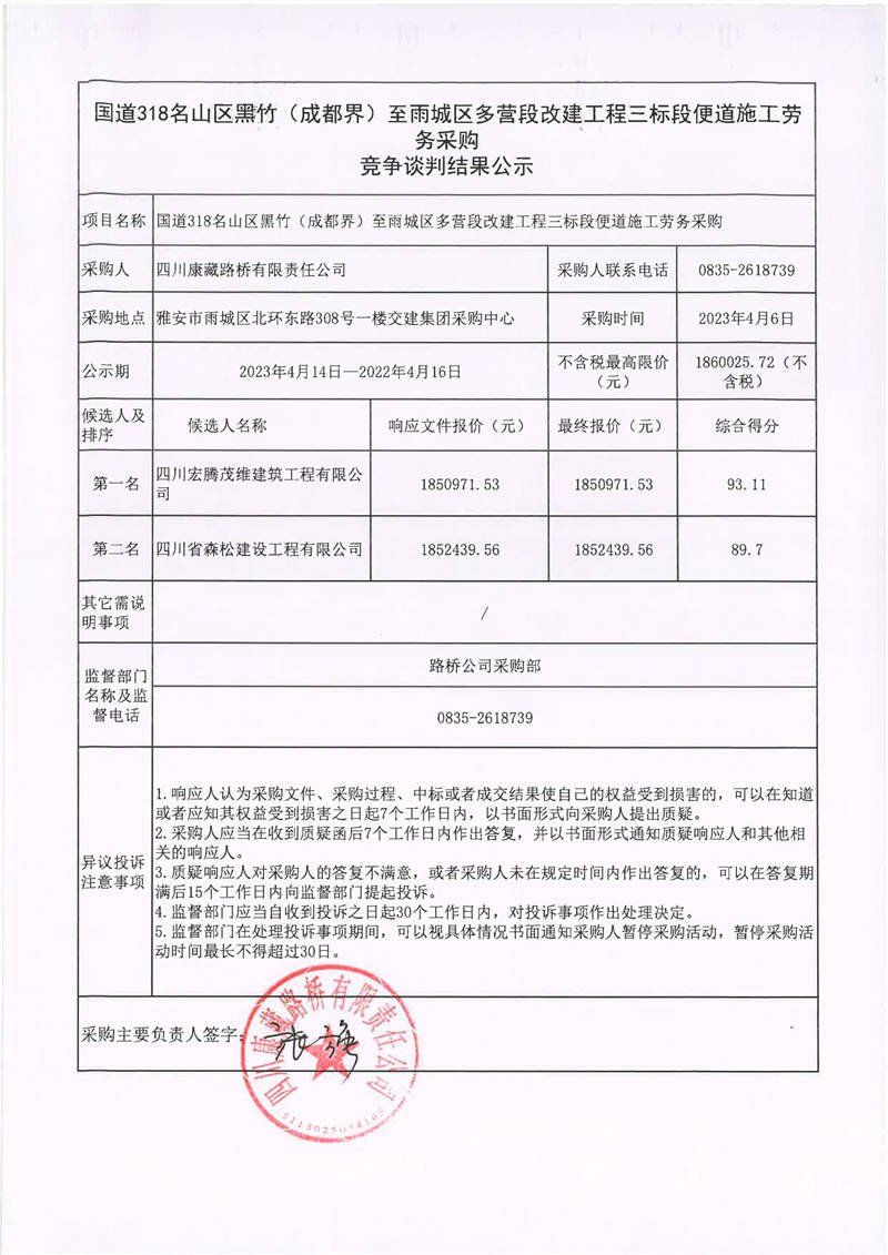 四川康藏路橋有限責任公司國道318名山區(qū)黑竹(成都界)至雨城區(qū)多營段改建工程三標段便道施工勞務采購結(jié)果公示