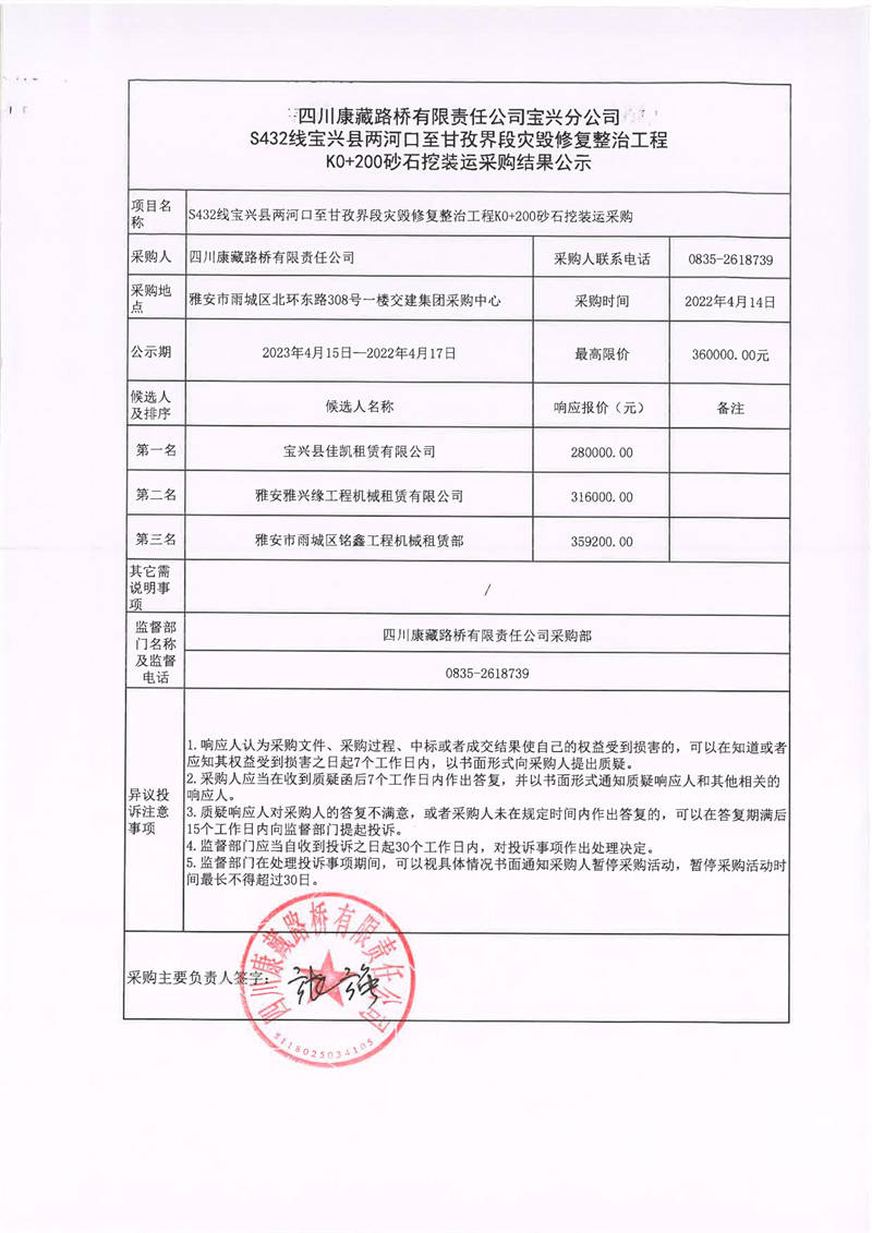 四川康藏路橋有限責任公司寶興分公司S432線寶興縣兩河口至甘孜界段災(zāi)毀修復(fù)整治工程K0+200砂石挖裝運采購結(jié)果公示