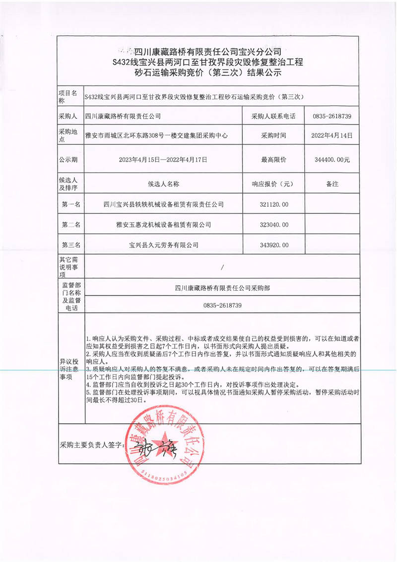 四川康藏路橋有限責(zé)任公司寶興分公司S432線寶興縣兩河口至甘孜界段災(zāi)毀修復(fù)整治工程砂石運(yùn)輸采購(gòu)競(jìng)價(jià)(第三次)結(jié)果公示
