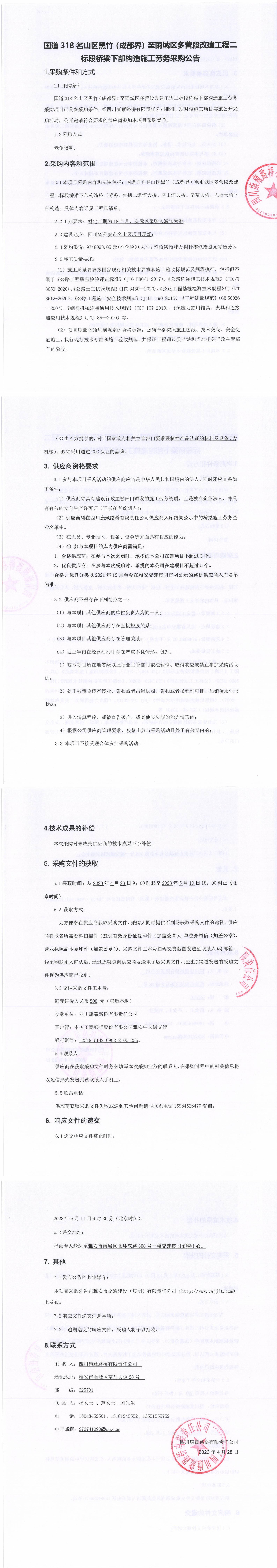 四川康藏路橋有限責任公司國道318名山區(qū)黑竹(成都界)至雨城區(qū)多營段改建工程一標段橋梁施工勞務采購公告