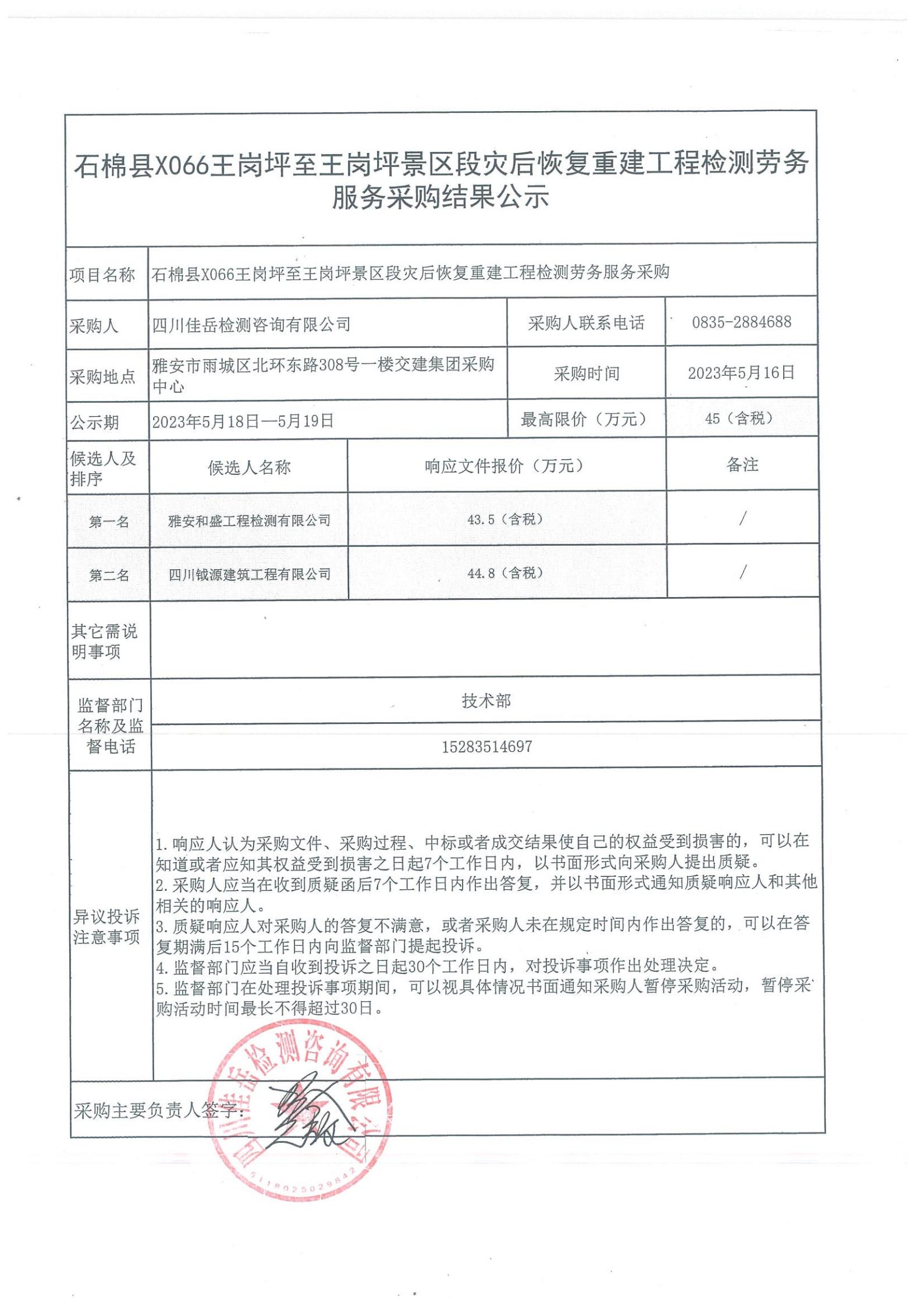 四川佳岳檢測(cè)咨詢有限公司石棉縣X066王崗坪至王崗坪景區(qū)段災(zāi)后恢復(fù)重建工程檢測(cè)勞務(wù)服務(wù)采購結(jié)果公示