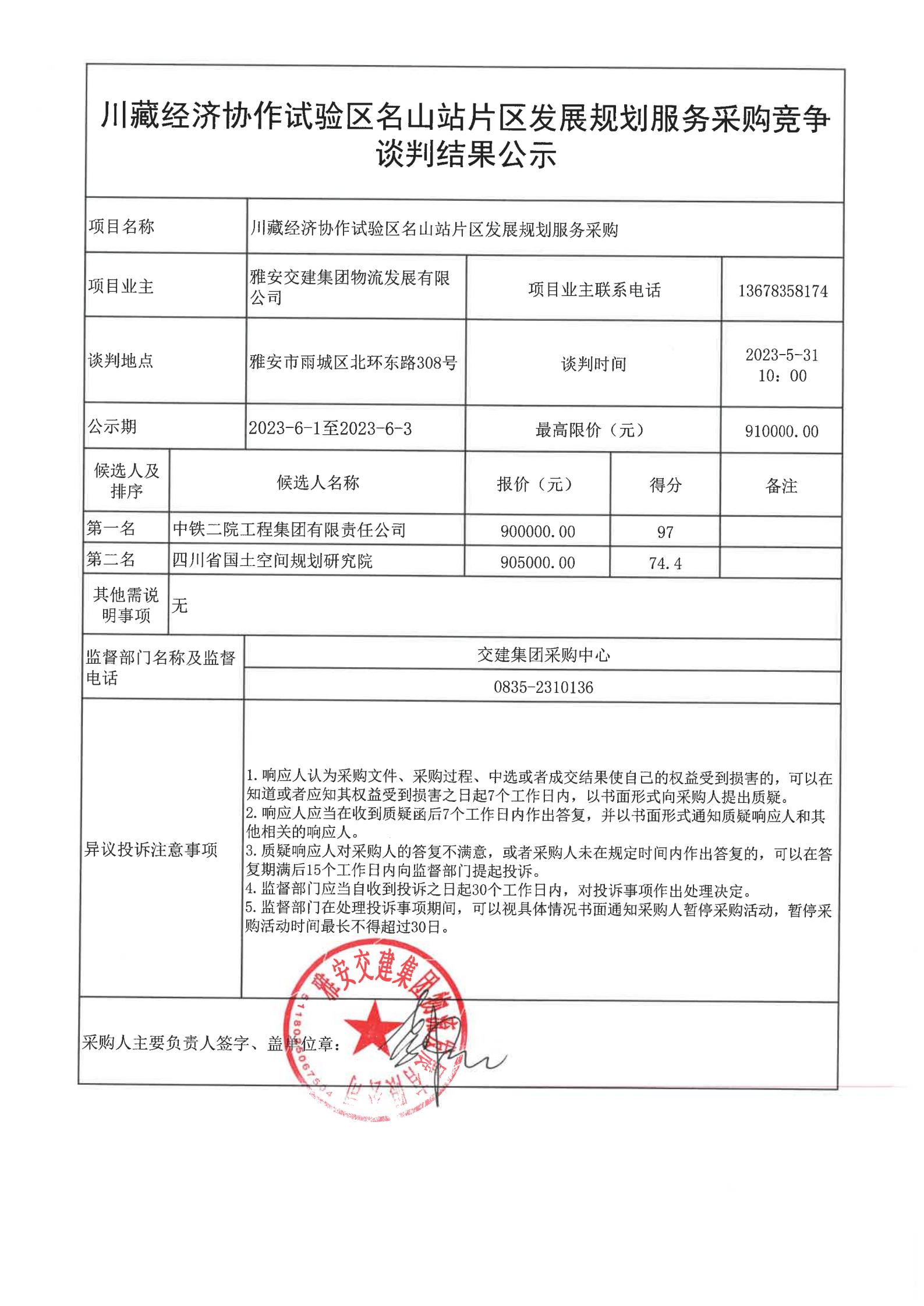 雅安交建集團(tuán)物流發(fā)展有限公司川藏經(jīng)濟(jì)協(xié)作試驗(yàn)區(qū)名山站片區(qū)發(fā)展規(guī)劃編制服務(wù)采購競(jìng)爭談判結(jié)果公示