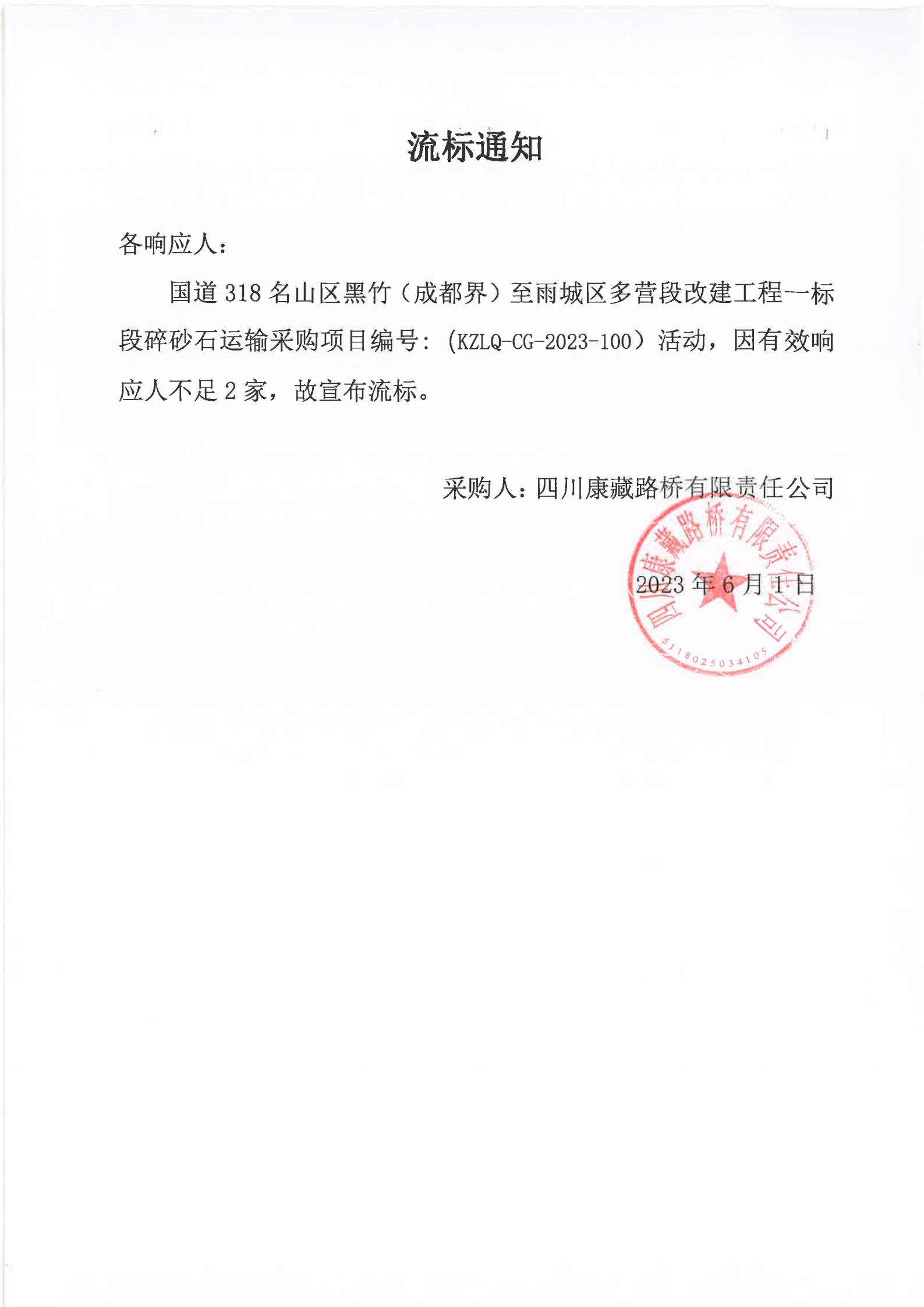 四川康藏路橋有限責任公司國道318名山區(qū)黑竹(成都界)至雨城區(qū)多營段改建工程一標段碎砂石運輸采購流標通知
