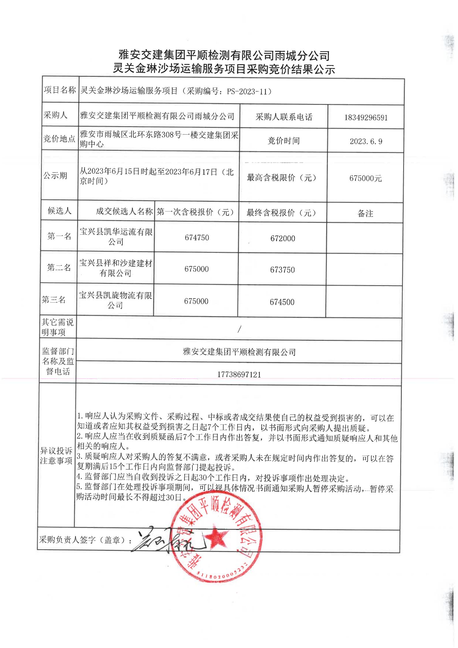 雅安交建集團(tuán)平順檢測有限公司雨城分公司靈關(guān)金琳沙場運輸服務(wù)競價結(jié)果公示