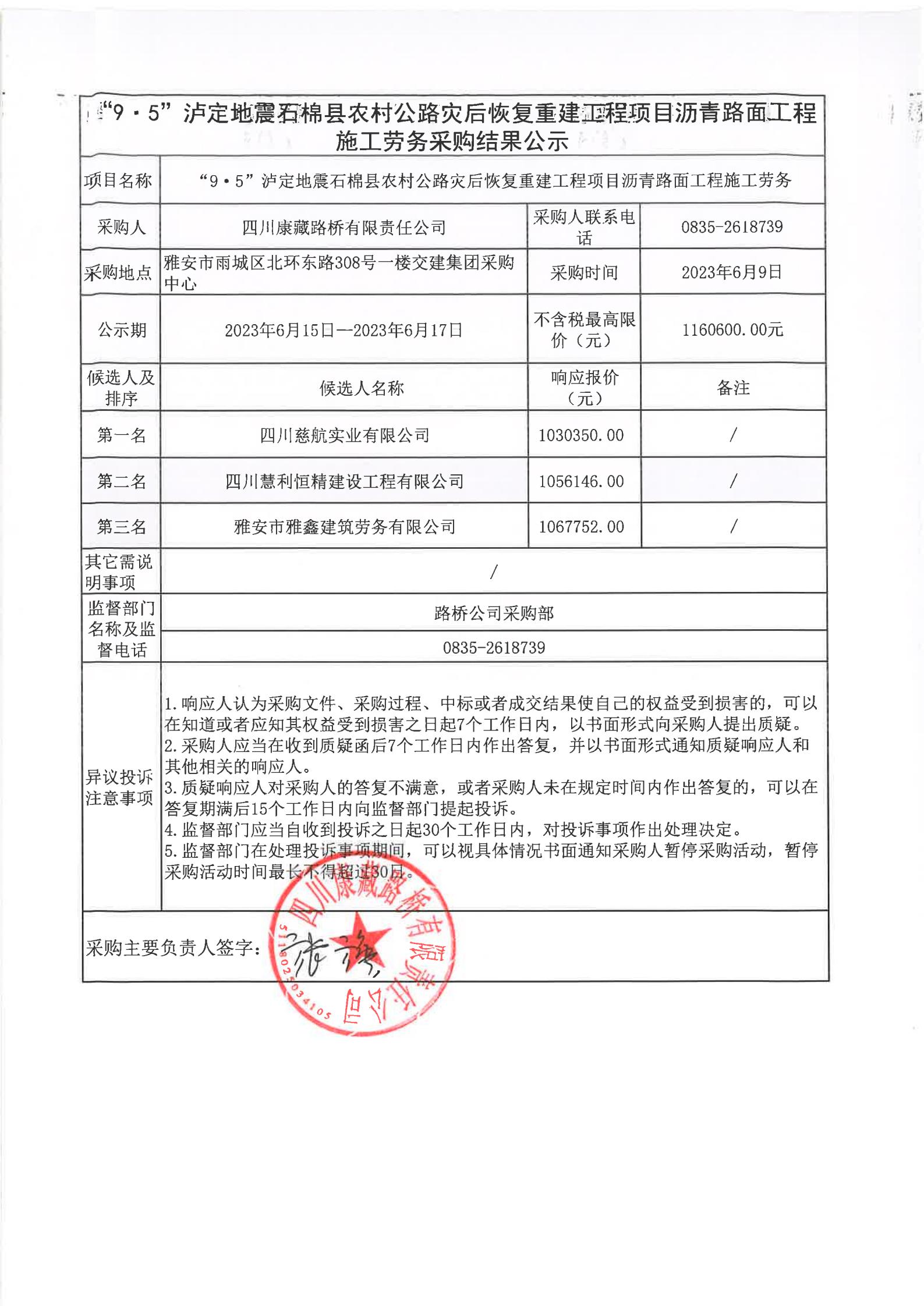 四川康藏路橋有限責任公司“9·5”瀘定地震石棉縣農村公路災后恢復重建工程項目混凝土路面工程施工勞務采購(第二次)結果公示