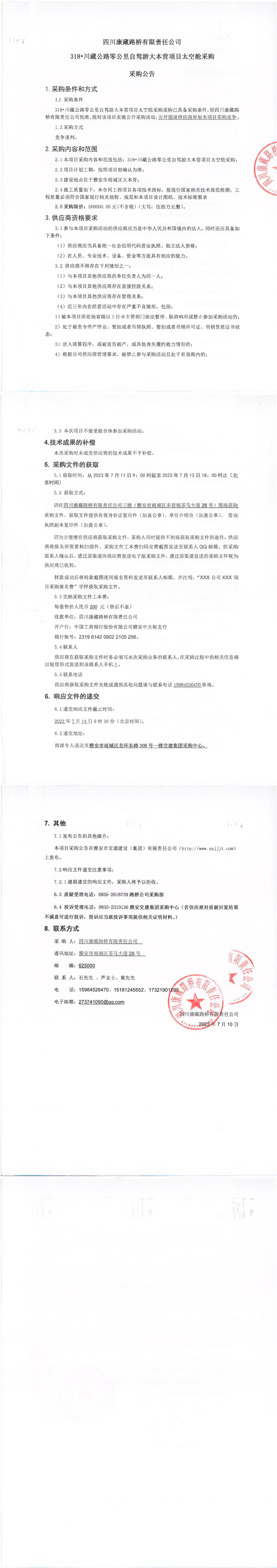四川康藏路橋有限責任公司318·川藏公路零公里自駕游大本營項目太空艙采購公告