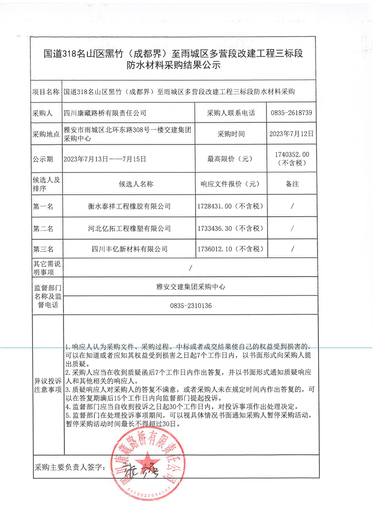 四川康藏路橋有限責(zé)任公司國(guó)道318名山區(qū)黑竹(成都界)至雨城區(qū)多營(yíng)段改建工程三標(biāo)段防水材料采購(gòu)結(jié)果公示