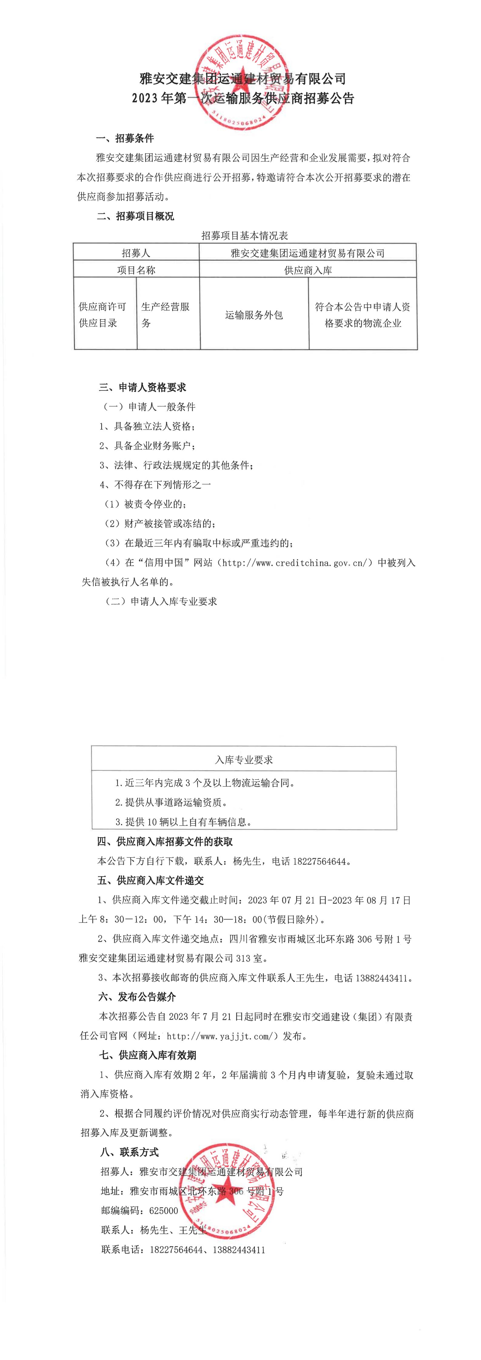 雅安交建集團運通建材貿易有限公司2023年第一次運輸服務供應商招募公告